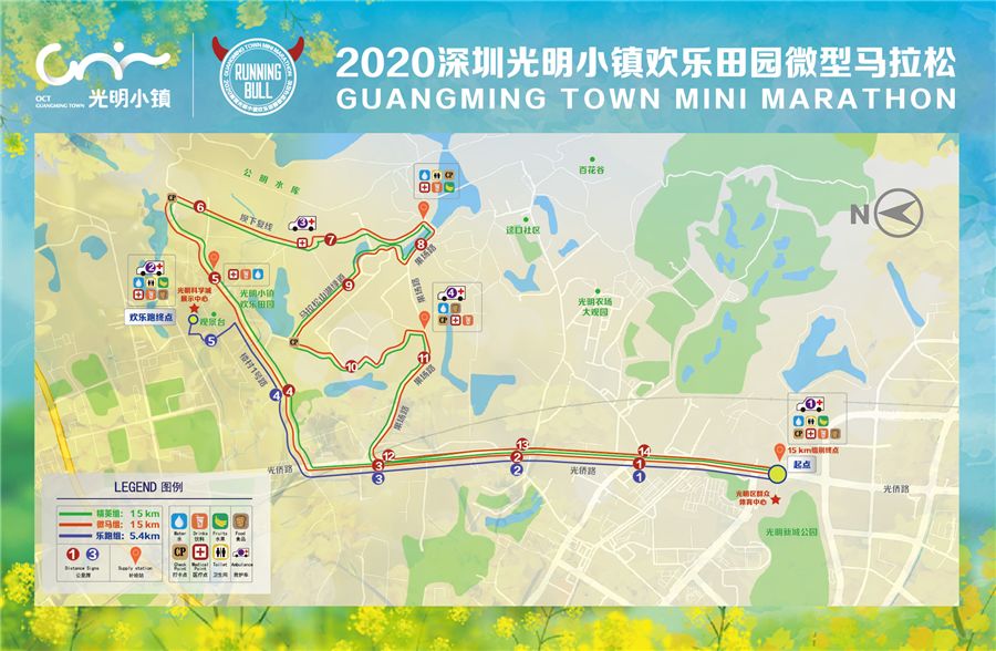 与其他路跑有所不同,光明微马的赛事路线深入光明区高品质生态文化旅游特色小镇——光明小镇之中,我们途经水库、花海、果园、山间小径,绵延两千亩油菜花一路相伴,朦胧梦幻的紫色马鞭草在身边随风摇曳,沉浸式体验令我们感受山水间的田园韵律,更能够感受人与自然和谐共生之美。